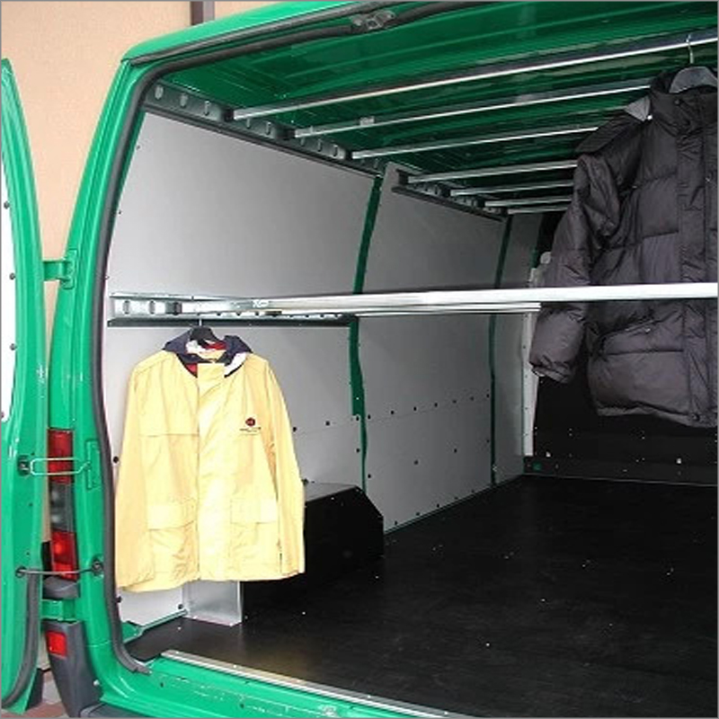 Όλο το υλικό είναι άμεσα διαθέσιμο από το απόθεμα, ΓΙΑ ΟΛΟΥΣ ΤΟΥΣ ΤΥΠΟΥΣ VAN! Η εγκατάσταση είναι γρήγορη και εύκολη: λίγες ώρες είναι το μόνο που χρειάζεται για να μετατρέψετε το βαν σας στο τέλειο όχημα για μεταφορά κρεμαστών ενδυμάτων.