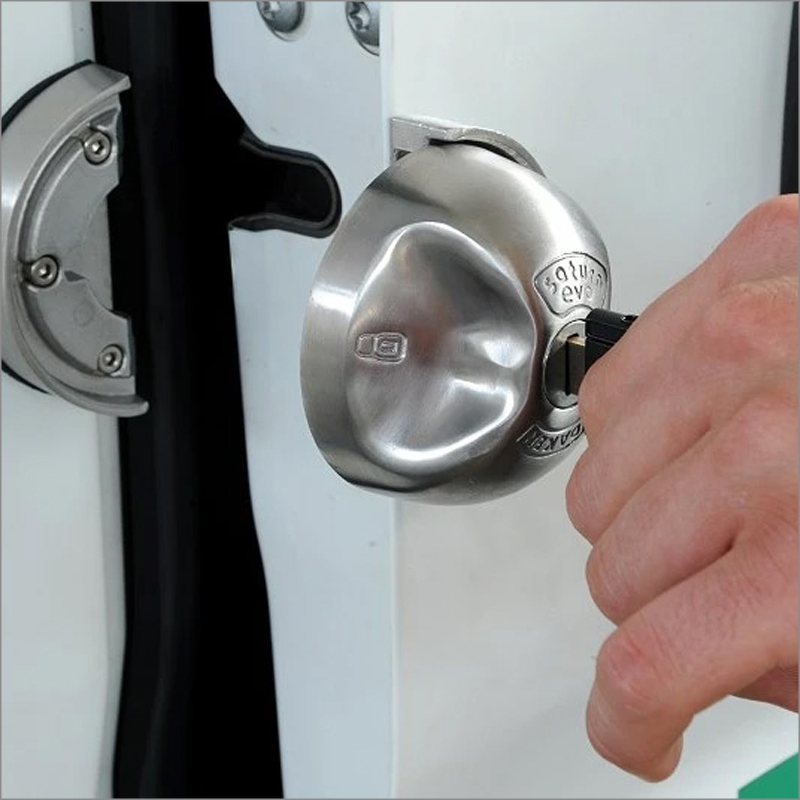 3 διαθέσιμα μοντέλα! Ημισφαιρικές κλειδαριές για να ασφαλίσετε τις πόρτες του βαν σας και να προστατεύσετε το φορτίο και τα ράφια στο εσωτερικό. Η κλειδαριά Ufo είναι ειδικά σχεδιασμένη για να προστατεύει το πολύτιμο περιεχόμενο του συστήματος ραφιών του φορτηγού σας.