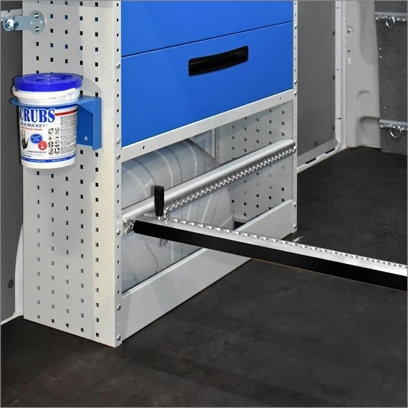 Για ασφαλή, γρήγορη και καθαρή μεταφορά κρεμαστών ρούχων! Οι κρεμαστές μπάρες ενδυμάτων της Syncro System ενσωματώνουν ένα σύστημα στερέωσης με ελατήριο που εμπλέκεται σε τρύπες στις ράγες για να εξασφαλίσει γρήγορη και εύκολη τοποθέτηση και αφαίρεση. Οι ράγες μπορούν να τοποθετηθούν όπου χρειαστείτε, ώστε να μπορείτε να εκμεταλλευτείτε το χώρο στο βαν σας με τον πιο αποτελεσματικό τρόπο.