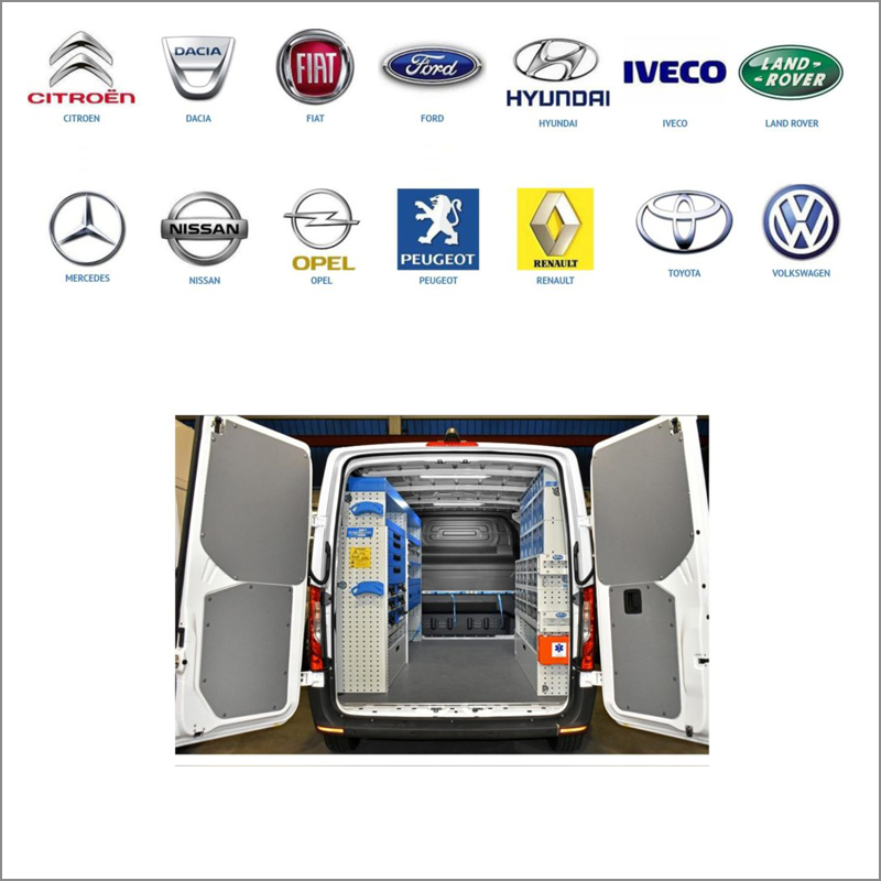 Οι λύσεις που προτείνουμε για τα ράφια επαγγελματικών αυτοκινήτων και van είναι συμβατές με τις παρακάτω μάρκες: Citroen, Dacia, Fiat, Ford, Hyundai, Iveco, Land Rover, Mercedes, Nissan, Opel, Peugeot, Renault, Toyota, Volkswagen.