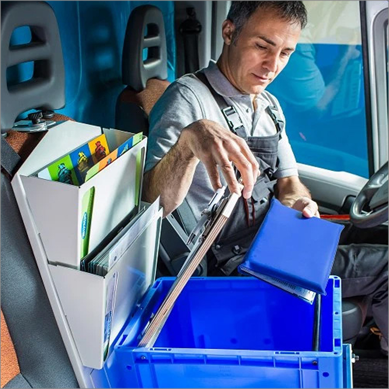 Το Syncro’s BOXSDL ORGANIZER προσαρμόζεται στο κάθισμα του συνοδηγού, χρησιμοποιώντας μόνο τη ζώνη ασφαλείας και έναν απλό σφιγκτήρα κάτω από το προσκέφαλο. Δύο τσέπες στο πίσω μέρος παρέχουν άφθονο χώρο για τιμοκαταλόγους, χάρτες και φυλλάδια. Η τσέπη του κινητού τηλεφώνου μπορεί να στερεωθεί σε οποιοδήποτε από τα τέσσερα σημεία και η πρακτική πλακέτα με κλιπ είναι ιδανική για να κρατάτε ένα σημειωματάριο και στυλό. Μια τρύπα στον πίνακα γραφής παρέχει πρακτική αποθήκευση για πλαστικά μπουκάλια. Το μπλε κουτί μπορεί να αφαιρεθεί ανά πάσα στιγμή, όπως και ολόκληρο το organizer , το οποίο χρειάζεται μόλις ένα λεπτό για να τοποθετηθεί και να αφαιρεθεί.